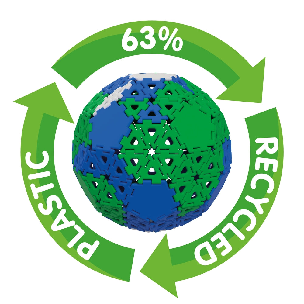 The shapes in this set offer a wealth of possibilities, making learning fun whilst developing key skills. The shapes easily snap together allowing children to learn about polarity which introduces magnetism through hands-on play. Mathematical concepts can also be explored as children create 2D and 3D shapes such as cubes and pyramids. The panels will challenge the creative instincts of children as well as allowing them to easily construct recognisable geometric shapes. Pack of 184 pieces. Includes 36 squares (60 x 60mm), 60 equilateral triangles, 24 right angle triangles, 12 rectangles, 12 pentagons, 20 mirror panels, 20 write on/off panels and an ideas poster. Made from 70% recycled plastic. BPA Free. Supplied in a reusable, recyclable carton. Sterilize with alcohol based sanitiser. Suitable for Age 3+.