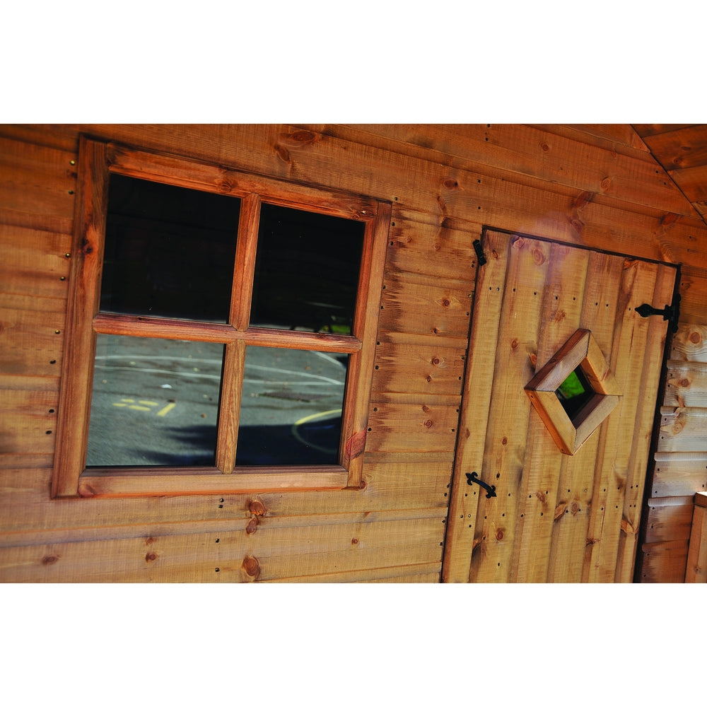 This Children's Den is of FSC solid redwood tongue and groove construction with 3 Georgian style windows and antique door handles and hinges. This item is CE marked and safety features include smooth surfaces inside and out, rounded edges on frames, and acrylic safety glass. Supplied with a base coat treatment and a solid wood floor. Overall dimensions H1850 x W1830 x D1830mm. Suitable for children aged 3+ years. This item will be delivered flat packed for self-assembly.