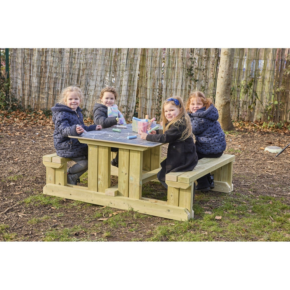 This Chalkboard Picnic Table is a versatile and durable play and dining table designed to foster creativity, interaction, and outdoor enjoyment. The all-weather and colour guaranteed chalkboard lid, with a 25-year warranty, offers a multifunctional platform for artistic expression, games, and interactive learning activities. This innovative and durable picnic table provides a long-lasting and engaging environment for children and adults to express themselves, encouraging imaginative play and fostering a love for creativity and outdoor exploration. L1200 x D1200 x H750mm.