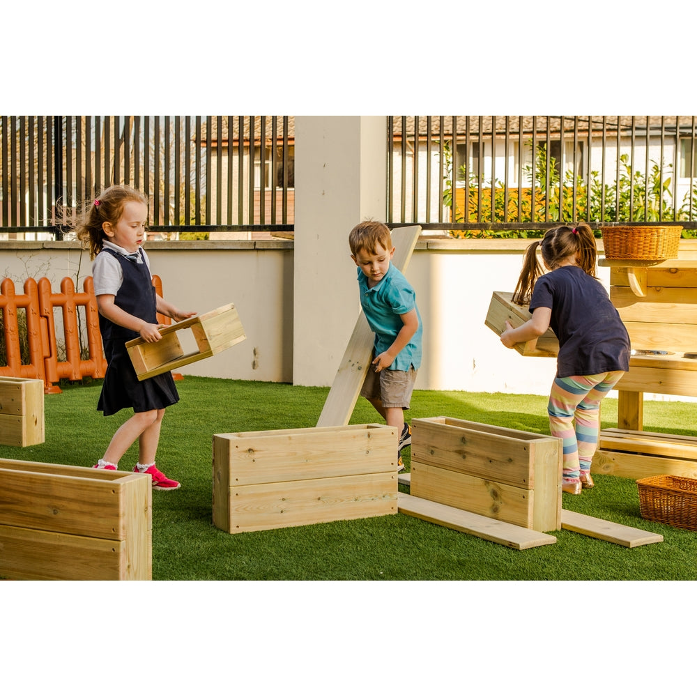 This very large set, which includes two carts with lockable wheels, is perfect for primary schools, offering a wide range of building possibilities and engaging play for young learners. The non-prescriptive nature of the set encourages children to explore and create in their own unique ways, fostering teamwork, problem-solving, and hands-on learning. The spacious and mobile design provides an extensive and immersive platform for children to engage in unstructured and imaginative play, promoting a stimulating and dynamic environment for creative expression and cooperative activities. L1200 x D800 x H1200mm.