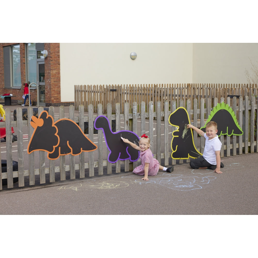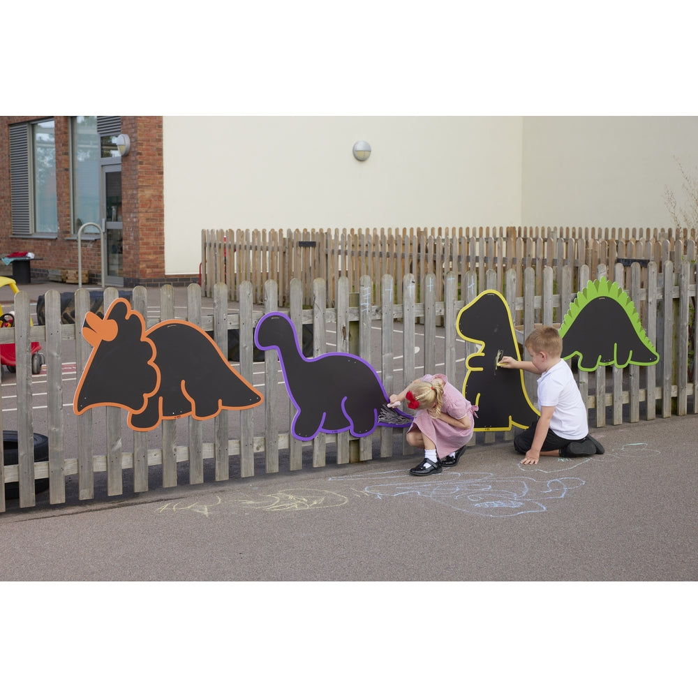 Inspire endless creativity, independent mark making, and social engagement with these recyclable, lightweight, smooth chalkboards. Chalks glide across their surface, allowing small and large movements, developing fine and gross motor skills. Transform indoor and outdoor spaces with vibrant colours and familiar shapes with our exclusive strong and durable designs. With pre-punched holes, the boards can be hung on fences, mounted on classroom walls as well as laid on floors or tables. Perfect for challenging and developing muscles and gross/fine motor skills in different ways. Designs include; triceratops (900 x 603mm), brontosaurus (900 x 625mm), t-rex (835 x x 815mm h), and stegosaurus (900 x 530mm).