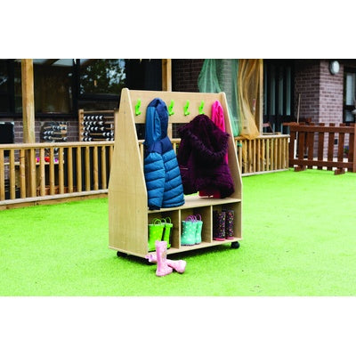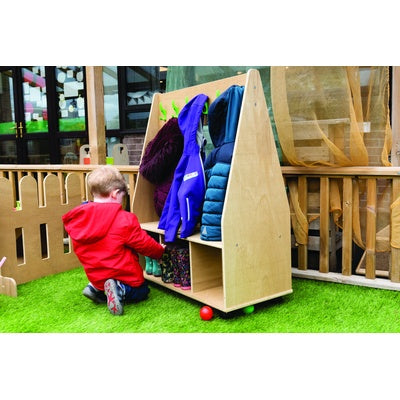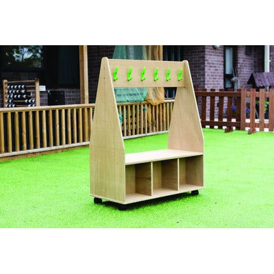 A mobile outdoor dress up trolley with twelve tough hooks and three cubby compartments on each side for added storage. Encourages children to be independent. Supplied with 12 tough hooks and castors for easy movement. Ultra-durable panel for outdoor use in the most demanding conditions. Leave outside indefinitely with no treatment required. Supplied in flat-pack form with easy to follow assembly instructions. W830 x D400 x H985mm.