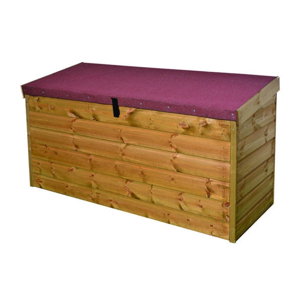 This outdoor chest even has a small sliding compartment inside to hold and separate smaller items (H120 x W750 x D460mm). All edges rounded for safety. Doors fitted with anti-trap strip to prevent finger injury. Manufactured from tongue and groove Scandinavian redwood timber (FSC and ideal for outdoor use - treated). Suitable for ages 3+. Requires adult supervision when opening/closing the lid. Delivered assembled to mainland UK only. For the Storage Chest without Assembly fee use product code 868888004. W1560 x D650 x H880mm.
