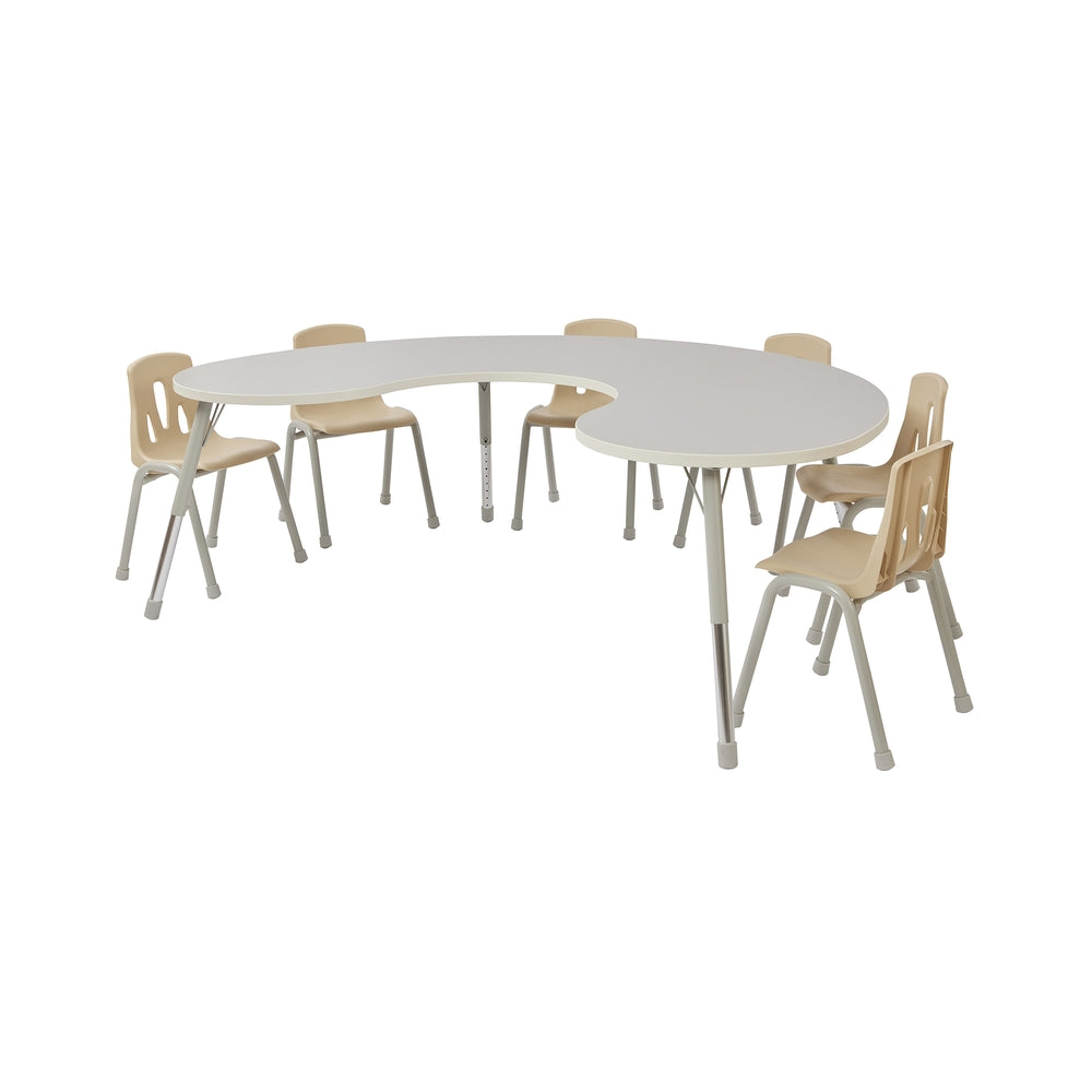 The modern Thrifty Group Table's tabletop is manufactured from 25mm hard wearing melamine faced engineered wood with a white PVC edging which is highly resistant to impact and abrasion helping to ensure long life. Corners and edges are rounded for safety and comfort. Table legs are made from sturdy and durable 34mm tubular metal powder coated legs which are highly durable and therefore do not chip or scratch easily. Fitted with rubber feet to prevent slipping and protect from scratching the floor. Meets EN1729 dimensional and safety requirements. Suitable for ages 2-8 years. Height adjustable legs (from 390 to 620mm). Supplied flat packed for easy assembly. W1800 x D1200mm.